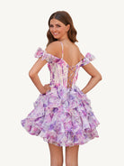 Make a dazzling entrance at your next cocktail party with this enchanting purple A-line mini dress. Crafted from airy tulle fabric, it features a romantic off-the-shoulder neckline and a structured corset bodice that accentuates your waistline. The sleeveless design and lace-up back add a flirty touch, while layers of soft ruffles create playful volume and movement. Perfect for cocktail parties, semi-formal events, or any occasion where you want to feel effortlessly beautiful.
