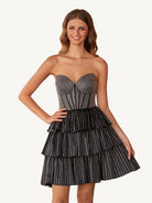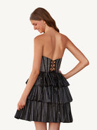 This stunning A-line dress is made from a glamorous sequin fabric that sparkles with every move. The strapless sweetheart neckline accentuates the bust, while the corset-style bodice provides a flattering fit. The intricate beading and playful ruffles combine elegance with a touch of whimsy, making it an ideal choice for any special occasion.